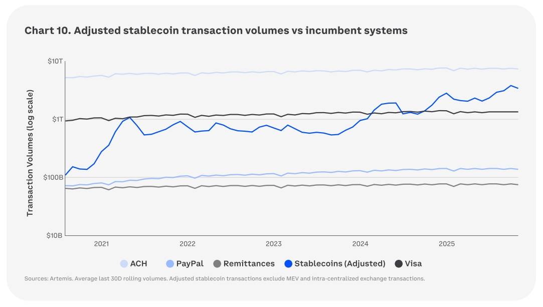 Trụ cột thứ ba và cũng là mảng có tính trường tồn nhất theo đánh giá của Coinbase - là stablecoin và các ứng dụng thanh toán. Khác với các chu kỳ đầu cơ, tăng trưởng stablecoin chủ yếu đến từ các nhu cầu thực tế như thanh toán, chuyển tiền xuyên biên giới, quyết toán và quản lý thanh khoản.