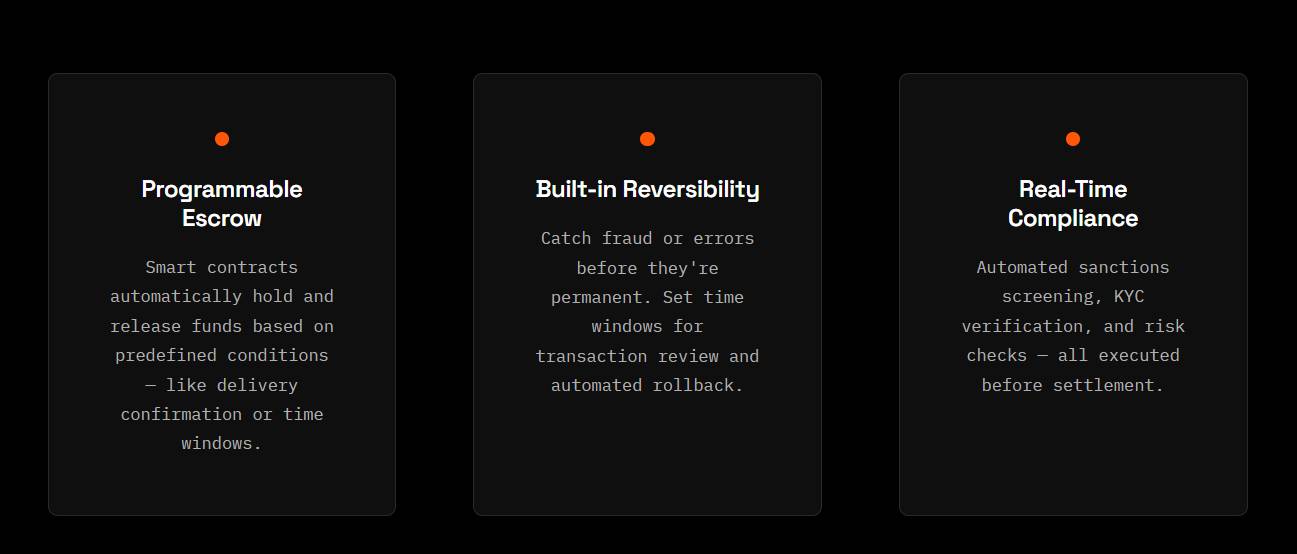 - Built-in Reversibility (Khả năng đảo ngược tích hợp): Hỗ trợ thiết lập các sổ lưu trữ dựa trên thời gian để rà soát giao dịch, cho phép phát hiện sai sót hoặc gian lận và hoàn tác trước khi giao dịch trở thành vĩnh viễn, từ đó khôi phục lưới an toàn vốn bị mất trong thanh toán blockchain tức thì.