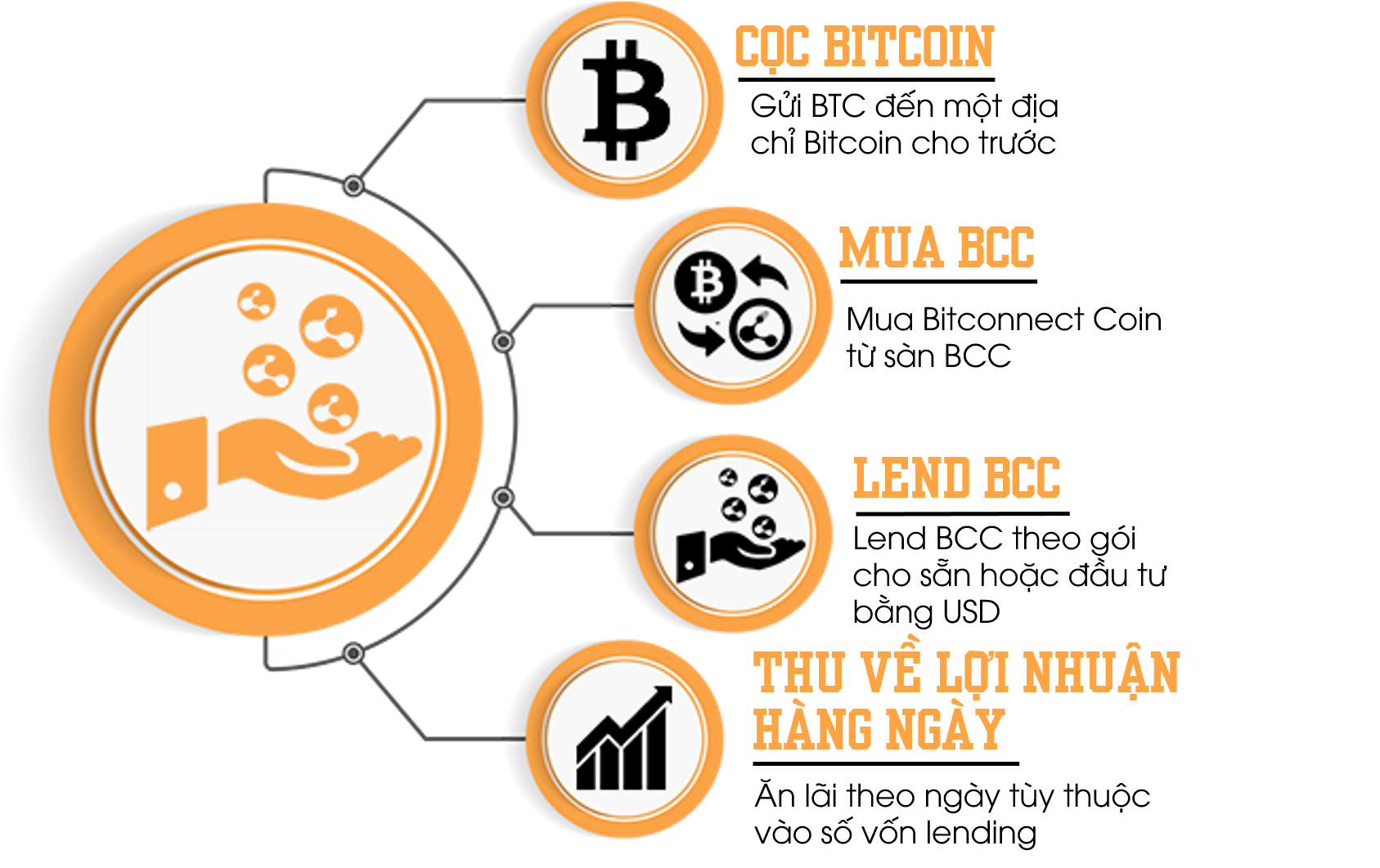 Một khi bạn đã sở hữu BCC, bạn sẽ được đảm bảo một mức lãi suất “lên đến 120% mỗi năm”. Người dùng Bitconnect thì được thông tin rằng công ty đang kiếm lãi suất bằng cách giữ Coin và phục vụ cho việc “duy trì an ninh mạng lưới.”