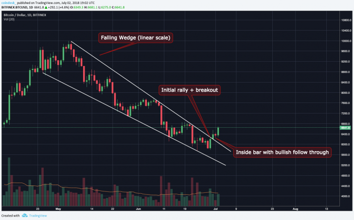 Nhìn về phía trước, Bitcoin trông có vẻ sắp thử tiếp cận lại mức $7,000 nhờ xuất hiện kiểu hình tăng giá, như có thể thấy trong các đồ thị giá phía dưới.