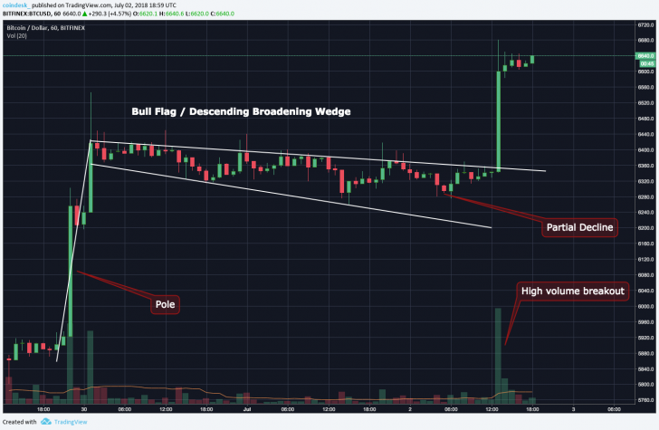 Sau khi đụng phải mức cản của mô hình cờ tăng giá, Bitcoin được cho là sẽ lại sớm quay về vùng hỗ trợ của cờ. Tuy nhiên, BTC lại bất ngờ tăng vọt trở lại từ $6,275, dọn sẵn tiền đề cho một cú tăng vượt lên phía trên.