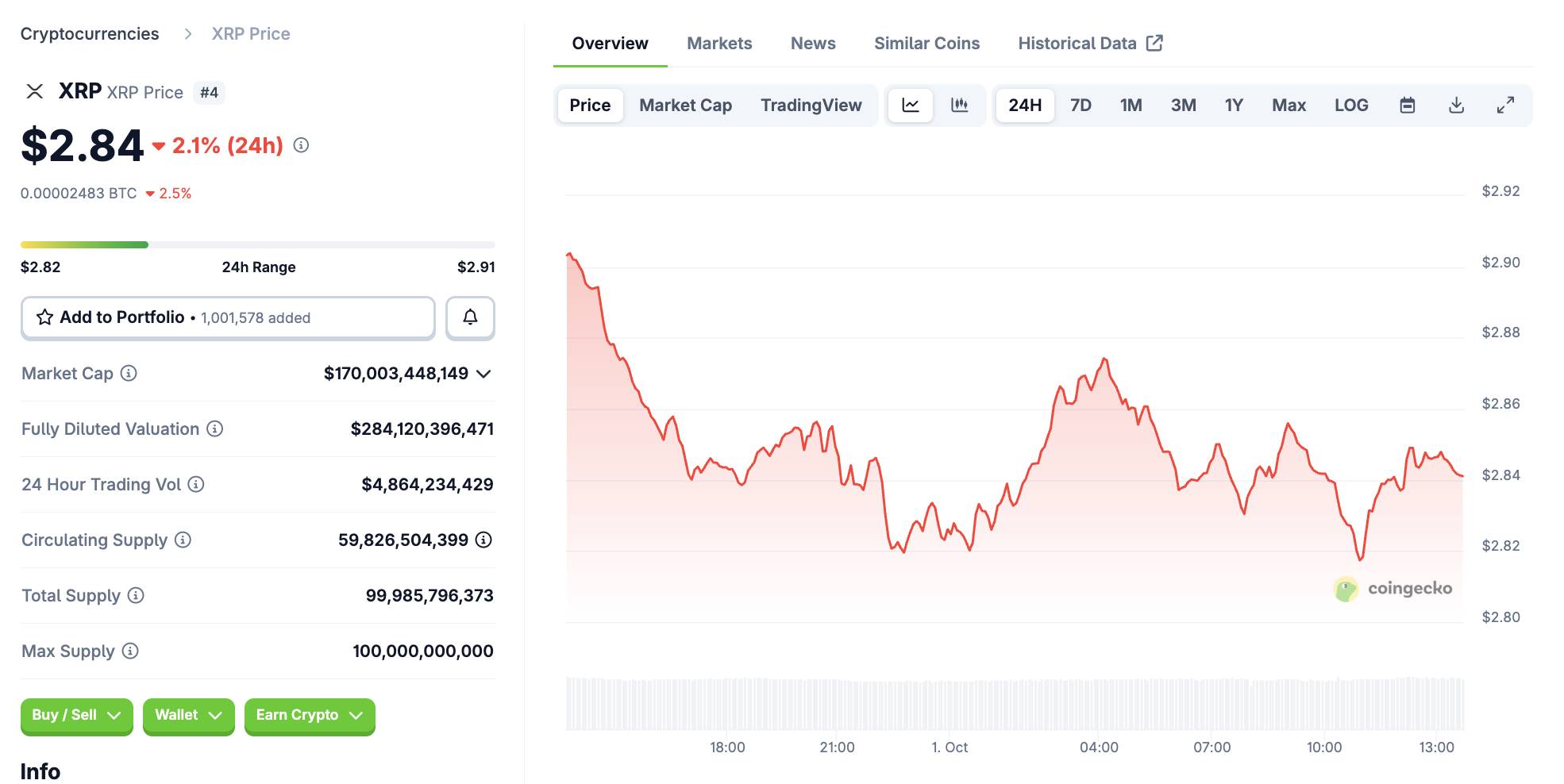 Biến động giá XRP trong 24 giờ qua, ảnh chụp màn hình trên CoinGecko lúc 02:10 PM ngày 01/10/2025