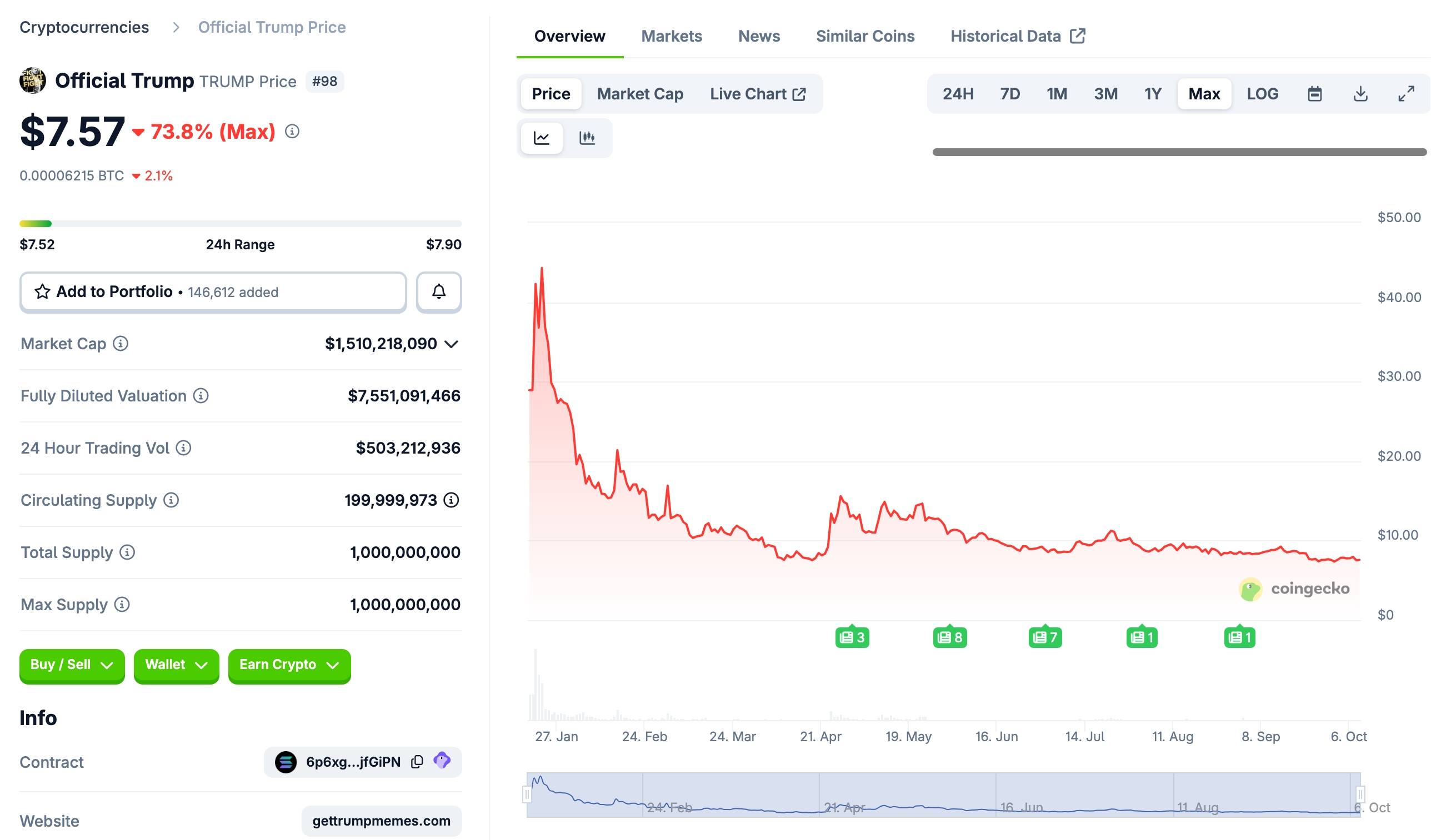 Biến động giá TRUMP kể từ lúc niêm yết giao dịch, ảnh chụp màn hình CoinGecko lúc 02:50 PM ngày 08/10/2025