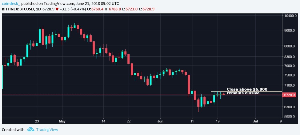 Bitcoin đã ghi nhận bấc nến vượt qua ngưỡng $6,800 trong 3 ngày gần nhất (trên sàn Bitfinex), tuy nhiên vẫn đóng nến ngày ở dưới $6,800.