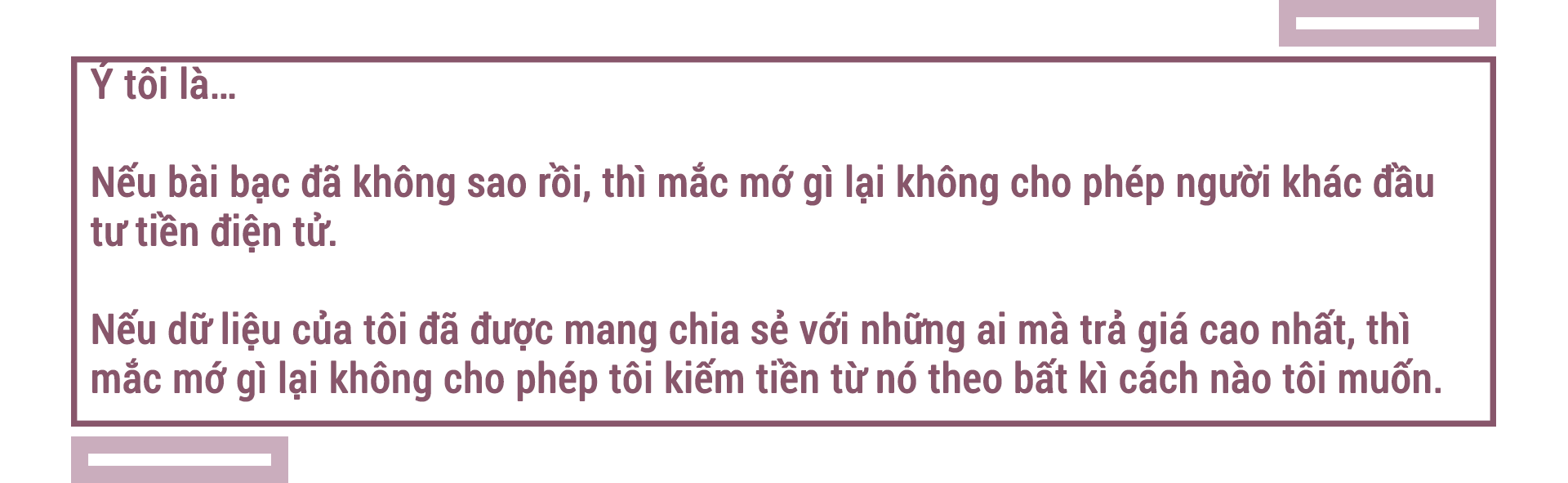 Tôi luôn bị cuốn hút bởi các ý tưởng mới, các dự án mới, các lối suy nghĩ sáng tạo và tiến bộ nói chung. Tôi cũng yêu cái khái niệm phân quyền hoá niềm tin và tiền bạc, cũng như cái siêu quyền lực, siêu trách nhiệm đi liền với nó. Rõ ràng, cuộc tranh luận về độ thật/ảo của tiền điện tử sẽ càng trở nên hấp dẫn khi tổng vốn hoá thị trường (của chỉ top 10 đồng coin hàng đầu) giờ đã đạt giá trị hàng trăm tỉ đô.