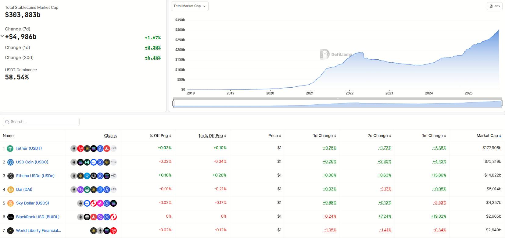 Theo dữ liệu từ DefiLlama (08/10/2025), tổng vốn hóa stablecoin toàn cầu đạt gần 304 tỷ USD, tăng hơn 6% trong tháng qua, cho thấy dòng vốn tổ chức đang ồ ạt quay lại thị trường sau khi Mỹ hợp pháp hóa stablecoin qua GENIUS Act.