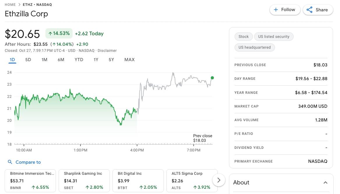 Biến động giá cổ phiếu ETHZ trong phiên giao dịch gần nhất, ảnh chụp màn hình trên Google Finance lúc 01:05 PM ngày 28/10/2025