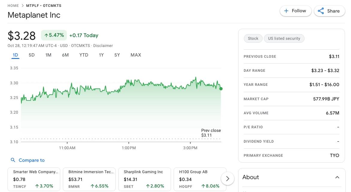Biến động giá cổ phiếu Metaplanet trong phiên giao dịch gần nhất, ảnh chụp màn hình trên Google Finance lúc 01:05 PM ngày 28/10/2025