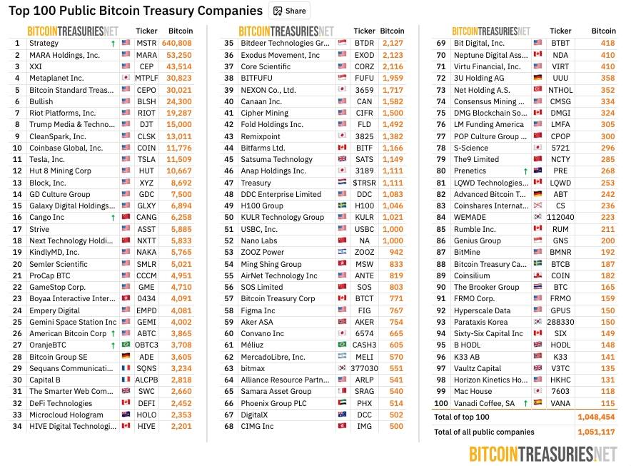Thống kê 100 công ty đại chúng nắm giữ BTC hàng đầu thế giới. Nguồn: Bitcoin Treasuries (Ngày 28/10/2025)