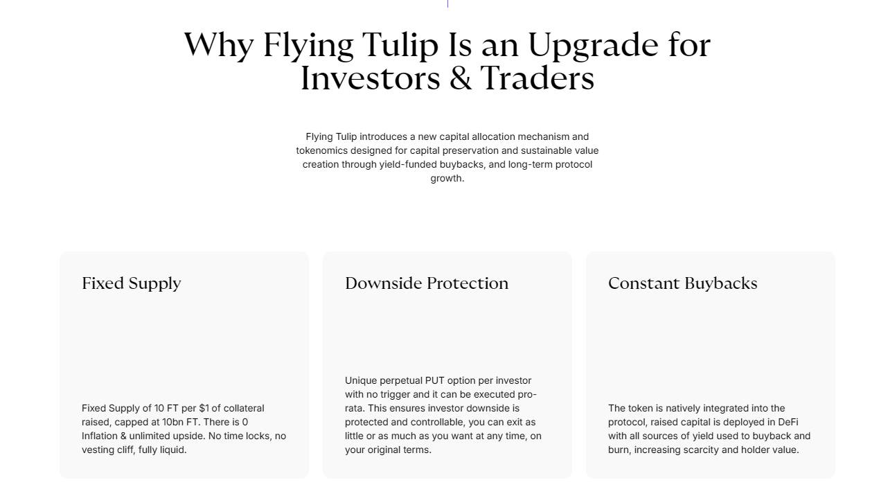 Đồng thời, mỗi nhà đầu tư còn được bảo vệ bởi cơ chế quyền chọn bán vĩnh viễn (perpetual put), cho phép họ rút vốn một phần hoặc toàn bộ bất kỳ lúc nào theo đúng điều kiện ban đầu, giúp kiểm soát rủi ro tối đa. Bên cạnh đó, toàn bộ lợi suất từ vốn huy động sẽ được dùng để mua lại và đốt token (buyback & burn), khiến nguồn cung ngày càng khan hiếm và gia tăng giá trị cho người nắm giữ. Nhờ những thiết kế này, Flying Tulip mang đến một chuẩn mực mới, cân bằng giữa an toàn vốn và tăng trưởng bền vững cho cả nhà đầu tư lẫn trader.