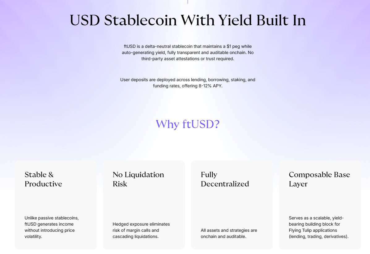 Một điểm khác biệt của Flying Tulip là việc phát hành stablecoin nội bộ mang tên ftUSD. Stablecoin này đóng vai trò trung gian trong hệ sinh thái, phục vụ giao dịch, mở vị thế đòn bẩy và tạo lợi suất. ftUSD còn là công cụ giúp hệ thống duy trì sự ổn định vốn và tạo ra dòng yield cho các hoạt động của nền tảng.