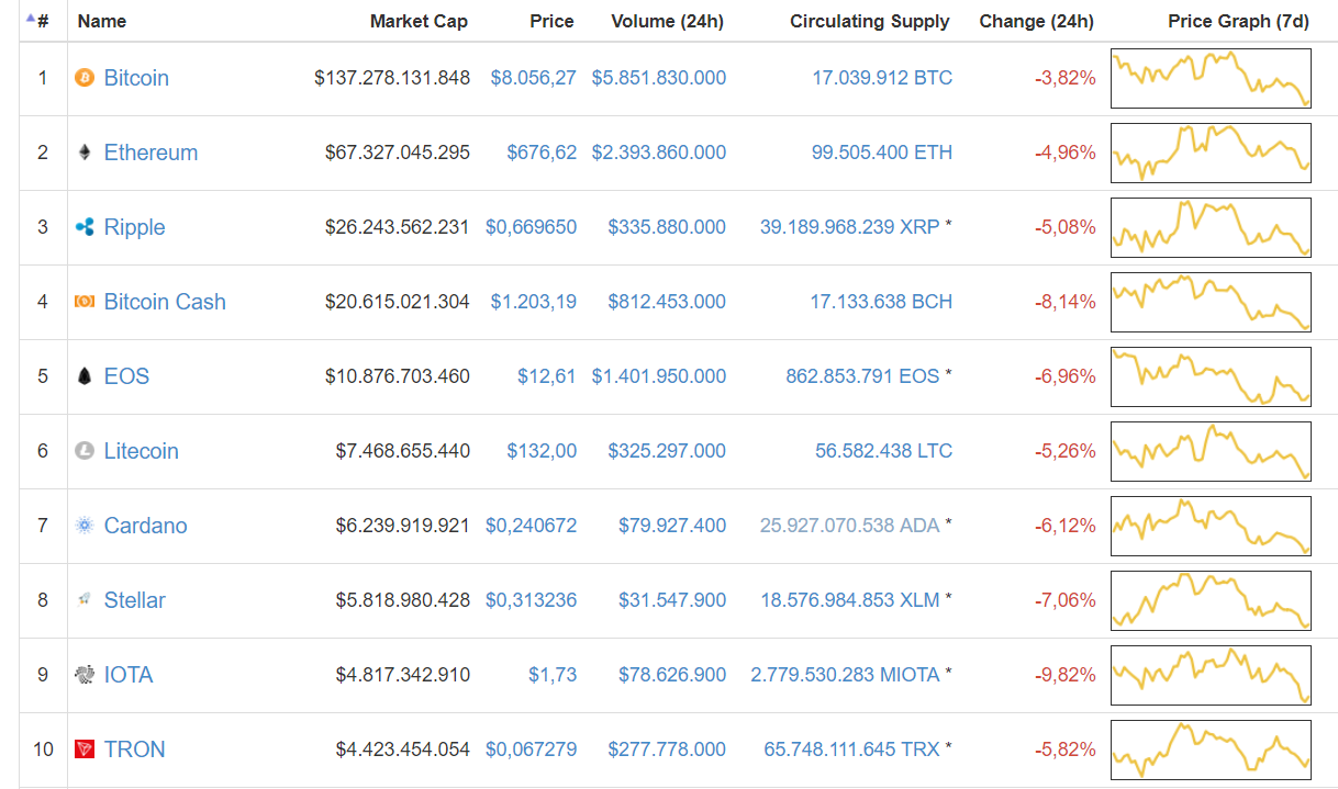 Vào khoảng 8 giờ sáng, Bitcoin đã giảm xuống thấp hơn mức $8,000, thiết lập mức thấp mới của ngày tại $7,974. BTC sau đó đã nhanh chóng phục hồi và hiện đang tạm thời ổn định trong khu vực từ $8,000 đến $8,100.
