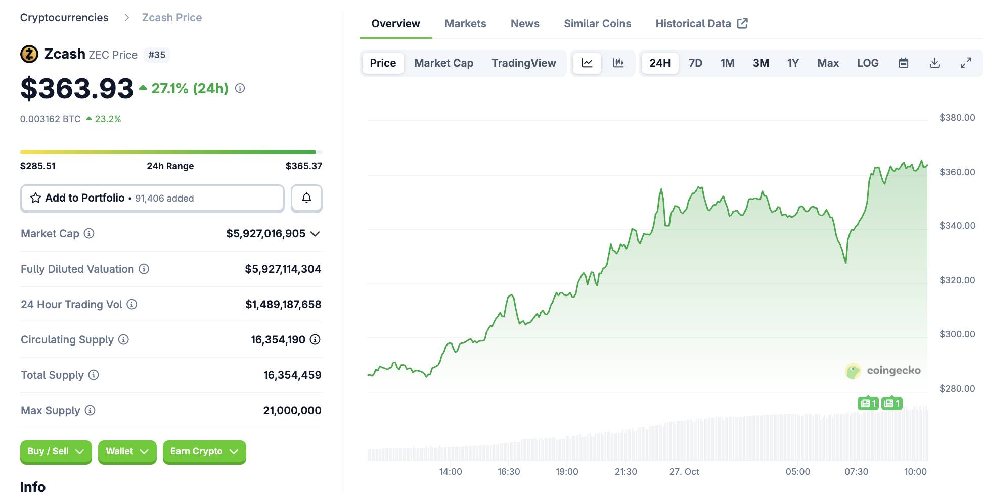 Theo dữ liệu từ CoinGecko, giá ZEC đã tăng từ khoảng 272 USD lên đỉnh 363 USD vào ngày 26/10, nâng tổng mức tăng trong 30 ngày qua lên 490%, đồng thời lần đầu tiên vượt mốc vốn hóa 5 tỷ USD sau hơn 3 năm, đưa ZEC trở thành token có hiệu suất tốt nhất trong top 50 token theo vốn hóa.