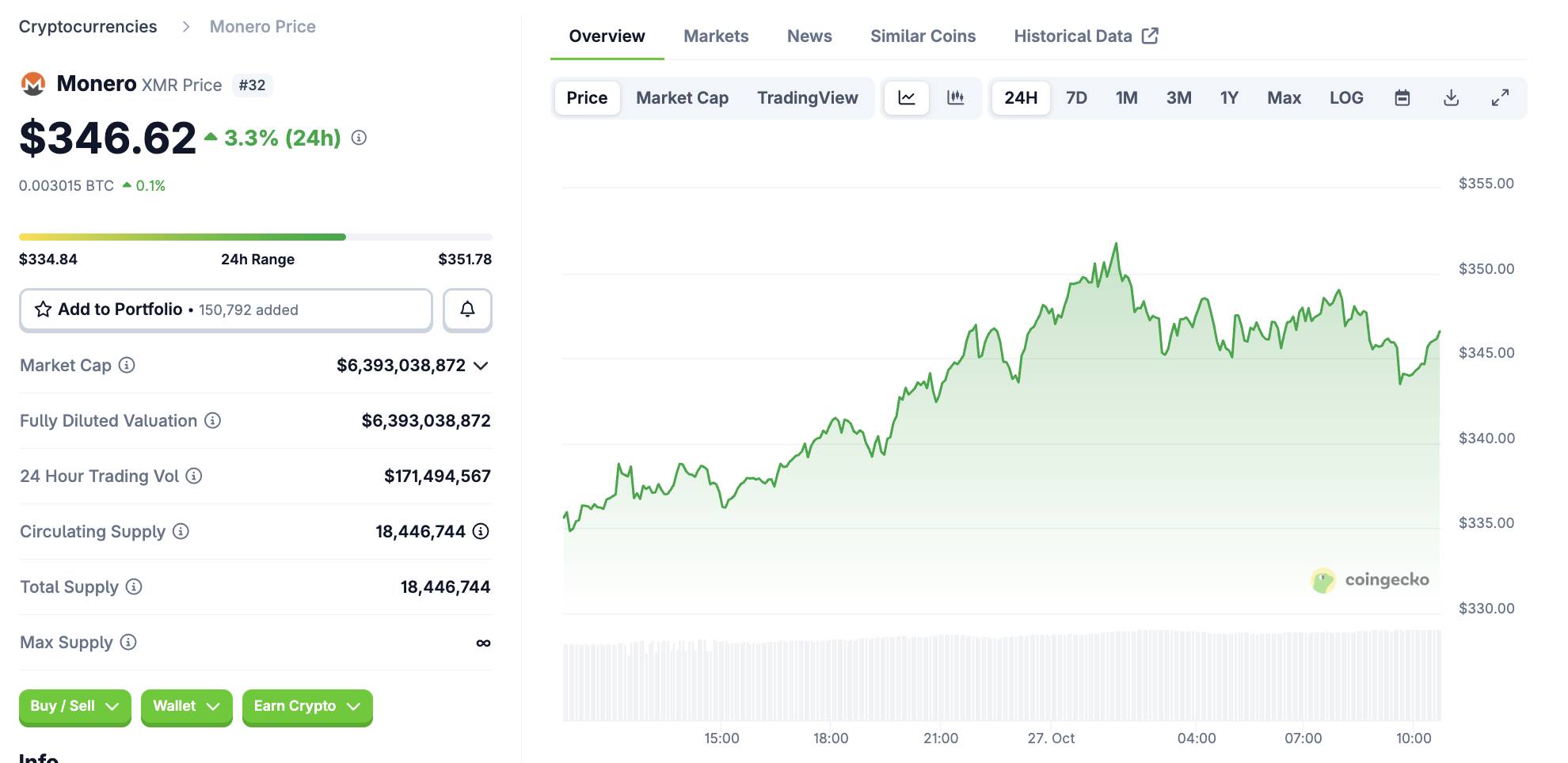 Biến động giá XMR trong 24 giờ qua, ảnh chụp màn hình trên CoinGecko lúc 10:40 AM ngày 27/10/2025