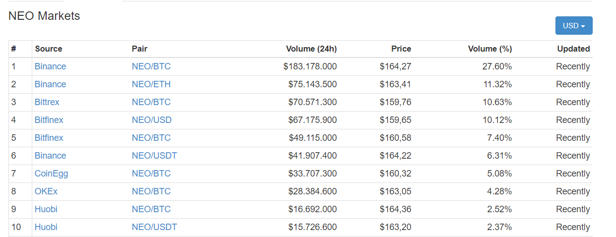 Đa phần lưu lượng mua bán trao đổi NEO gần đây đến từ những cặp tỉ giá với Bitcoin. Trong số các sàn giao dịch, Binance rõ ràng là đang dẫn đầu quá trình đi lên của NEO với số thương vụ trị giá 183 triệu đô trong 1 ngày qua. Xếp sau đó là Bittrex, Bitfinex và OKEX. Tuy nhiên, điểm cần lưu ý là chỉ có một cặp tỉ giá duy nhất giữa NEO và USD xuất hiện, cho thấy có rất ít thanh khoản đang được đổ vào hệ sinh thái này.