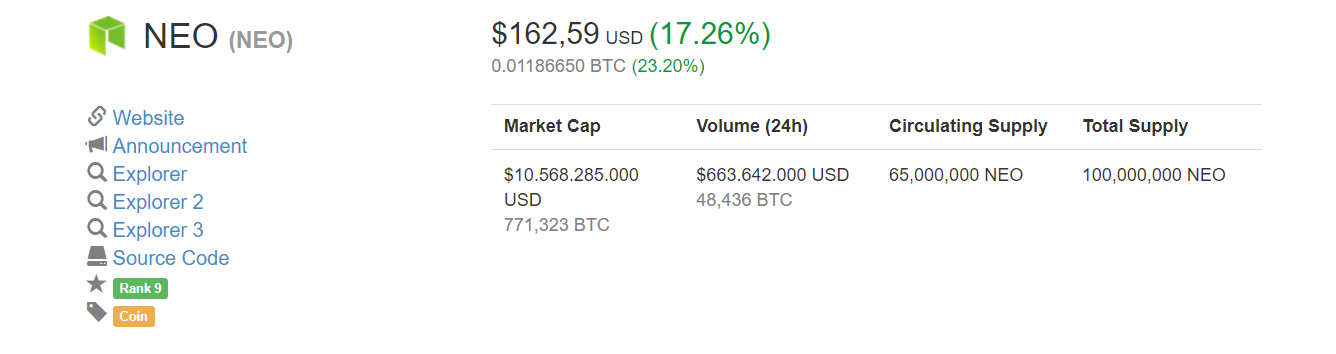Để các bạn có cái nhìn rõ hơn thì giá NEO đã tăng vọt từ mức $111 lên $170 mà không gặp bất cứ khó khăn đáng kể nào cả. Động lực tăng trưởng như thế là hết sức ấn tượng, vì không phải altcoin nào cũng có thể có được thành công tương tự trong thời gian gần đây. Thật vậy, ở thời điểm thực hiện bài viết thì trừ NEO ra, gần như mọi altcoin trong top 20 đồng tiền điện tử hàng đầu đều đang bị chỉnh giá theo Bitcoin.