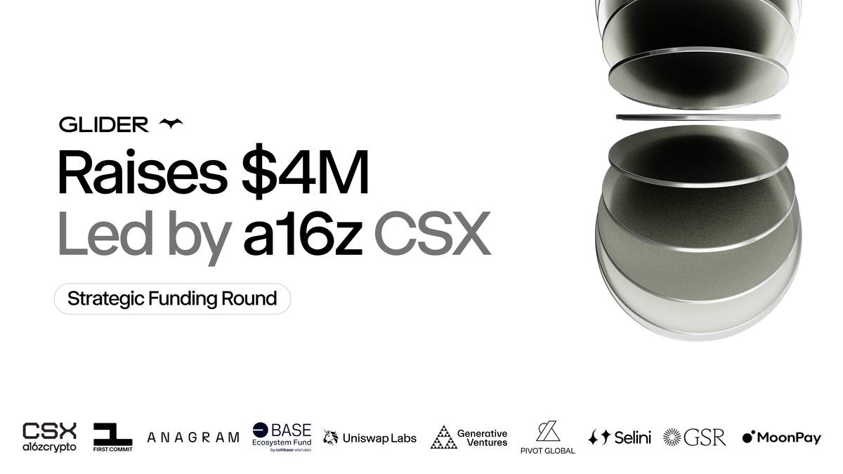 Glider huy động được 4 triệu USD ở vòng Seed do Andreessen Horowitz (a16z) dẫn đầu, cùng với sự tham gia của các quỹ khác như Coinbase Ventures, GSR Markets, Uniswap Labs Ventures,...