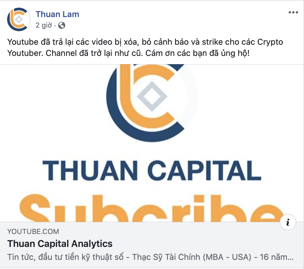 Một kênh YouTube nổi tiếng trong cộng đồng Việt Nam là Thuận Capital cũng đăng thông báo về việc YouTube đã khôi phục các video.
