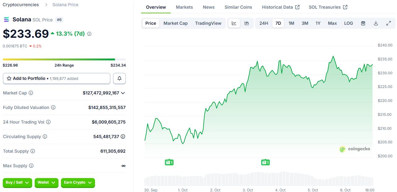Biến động giá trong 24h gần nhất của SOL chụp vào 07:20 PM ngày 06/10/2025 trên CoinGecko