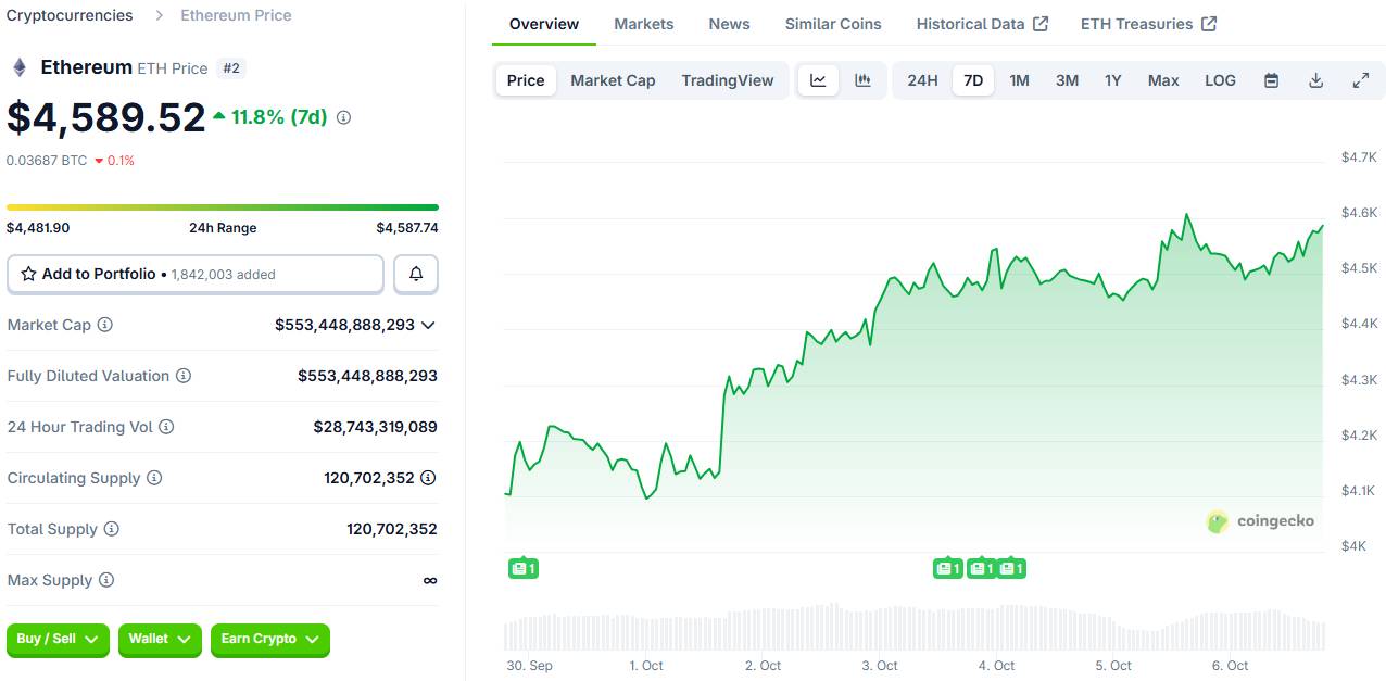 Biến động giá trong 24h gần nhất của ETH chụp vào 07:20 PM ngày 06/10/2025 trên CoinGecko
