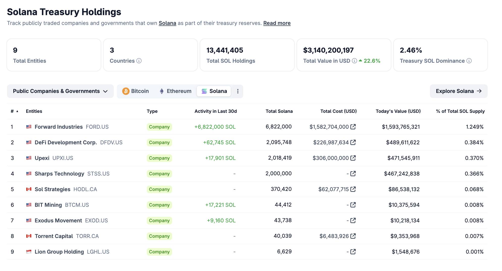 - Thương vụ gom SOL đã giúp Solana Company vươn lên vị trí thứ 2 trong danh sách các công ty đại chúng nắm giữ nhiều SOL nhất hiện nay. Công ty này đã vượt qua DeFi Development Corp (đang nắm giữ khoảng 489,55 triệu USD SOL) và hiện chỉ đứng sau Forward Industries, đơn vị đang sở hữu tới 1,59 tỷ USD SOL.
