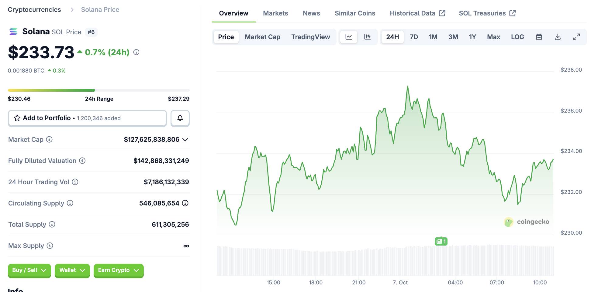 - Tại thời điểm viết bài, giá SOL đang dao động quanh mức 233,73 USD, tăng nhẹ 0,7% trong 24 giờ qua.