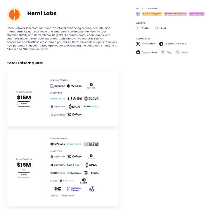 Hemi đã huy động được tổng cộng khoảng 30 triệu USD vốn đầu tư để phát triển công nghệ và mở rộng hệ sinh thái. Đặc biệt, trong vòng hạt giống 15 triệu USD vào tháng 9/2024, YZi Labs (trước đây là Binance Labs) đóng vai trò dẫn đầu, cùng sự tham gia của nhiều quỹ và nhà đầu tư uy tín như Republic Digital, HyperChain Capital, Breyer Capital, Big Brain.