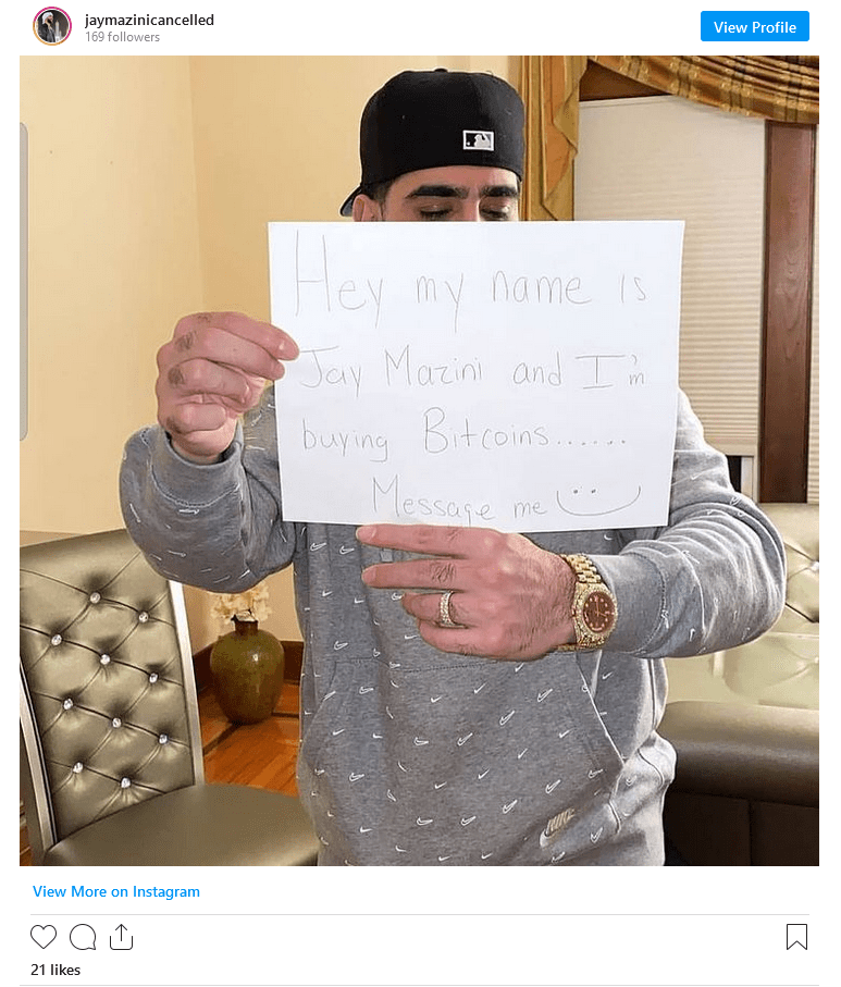 Người có ảnh hưởng trên phương tiện truyền thông xã hội Jay Mazini, người khoe khoang tài sản ròng trị giá 33 triệu USD và được biết đến với “cash giveaways”, bị Bộ Tư pháp cáo buộc điều hành một kế hoạch lừa đảo qua điện thoại, khi lừa một số trong số 1 triệu người theo dõi của mình để gửi cho anh ta Bitcoin để đổi lấy tiền mặt với số lượng lớn hơn, mà anh ta đã tất nhiên không làm điều đó khi nhận được Bitcoin.