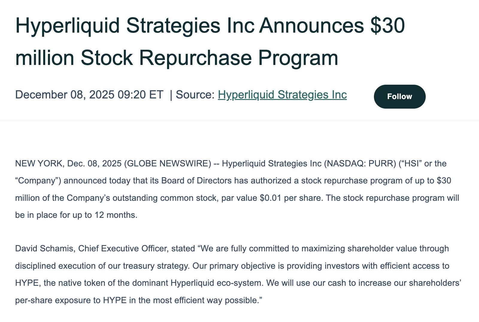 Hyperliquid Strategies thông báo chiến lược mua lại 30 triệu USD cổ phiếu