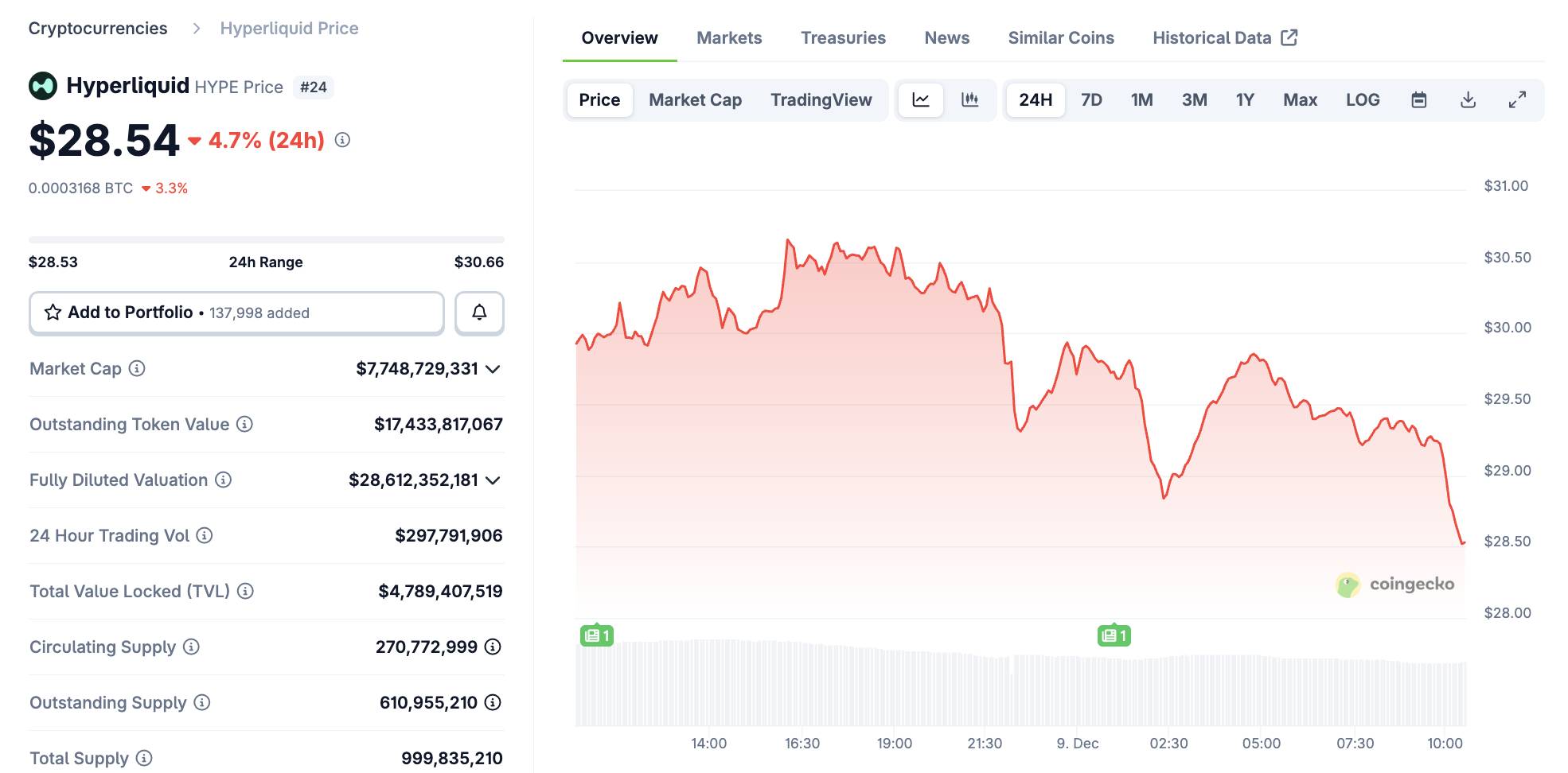 Tại thời điểm viết bài, giá HYPE hiện đang dao động quanh 28,54 USD, ghi nhận mức giảm 4,7% trong 24 giờ qua.
