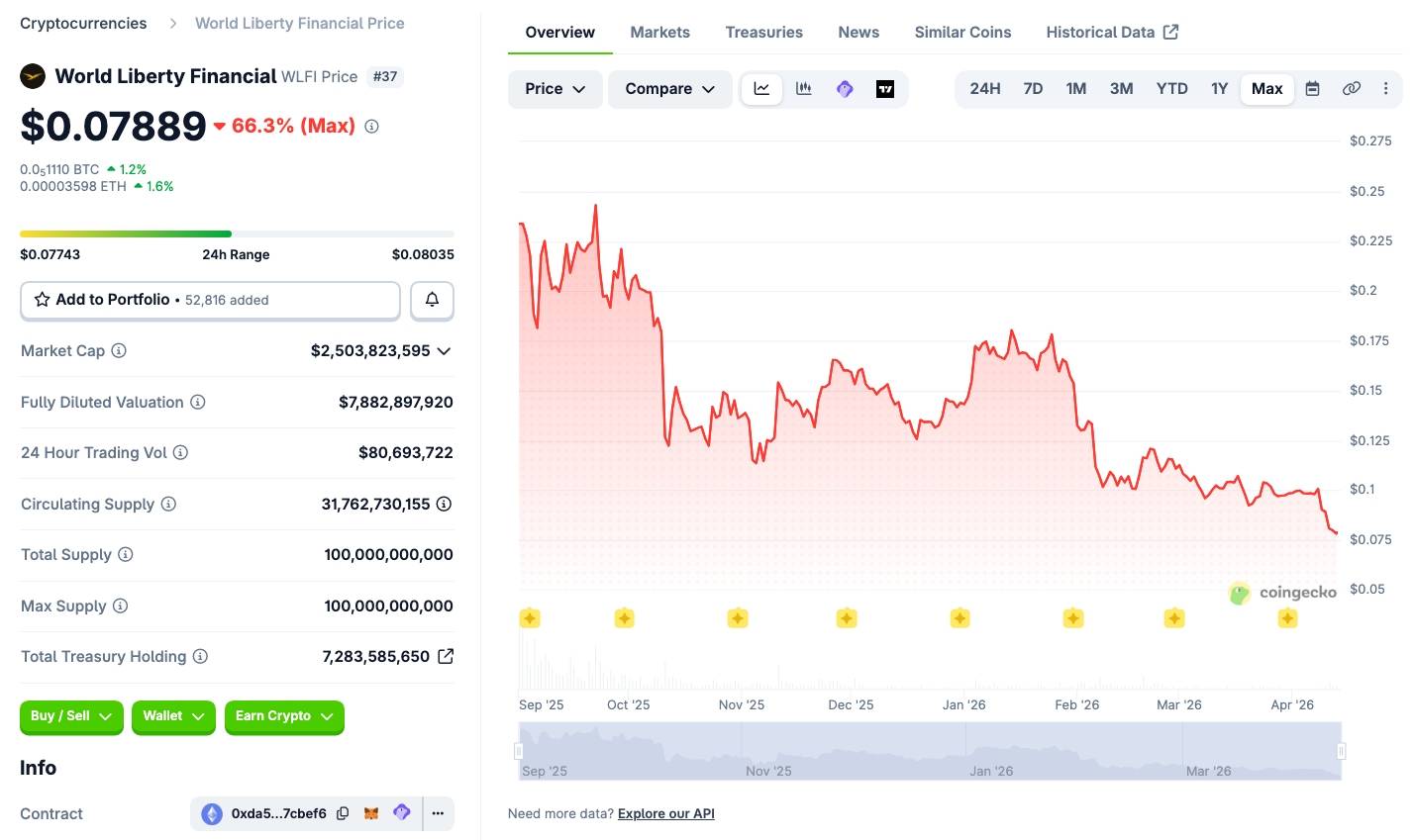 Giá WLFI hiện giao dịch quanh vùng 0,08 USD, gần như đi ngang trong ngắn hạn song vẫn nằm sát vùng đáy kể từ khi ra mắt. So với giai đoạn đầu niêm yết, giá token đã giảm sâu đến 66%.