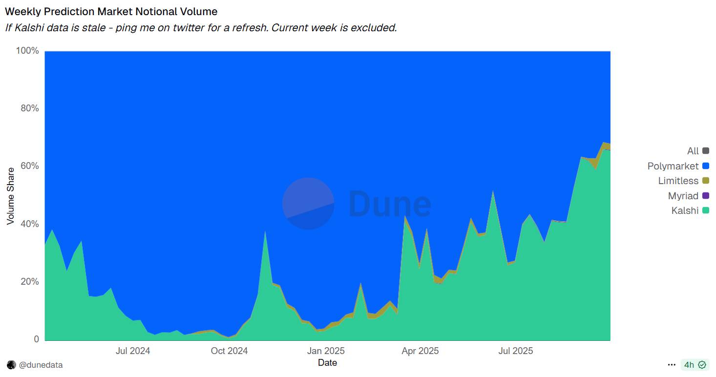 Thống kê thị phần khối lượng giao dịch của Kalshi trong lĩnh vực Prediction Markets. Nguồn: Dune - @dunedata (Ngày 10/10/2025)