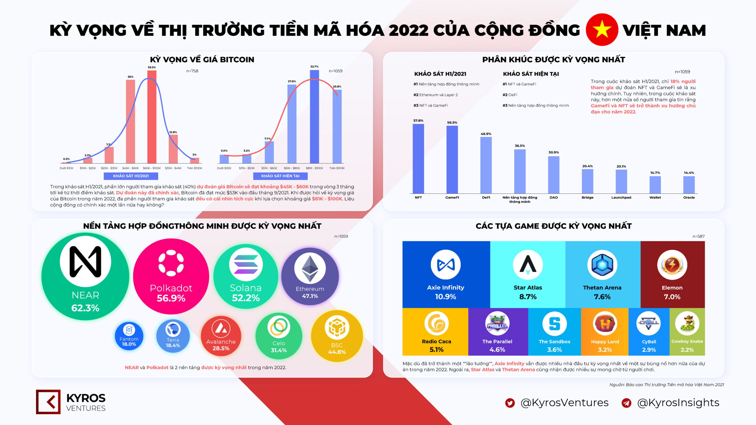 NFT và GameFi mới là những xu hướng được kỳ vọng nhiều nhất với hơn 50% người tham gia khảo sát gọi tên hai phân khúc này khi được hỏi về xu hướng chủ đạo trong năm 2022, mức bật tăng ấn tượng so với con số 18% khiêm tốn trong khảo sát vào nửa đầu năm 2021.