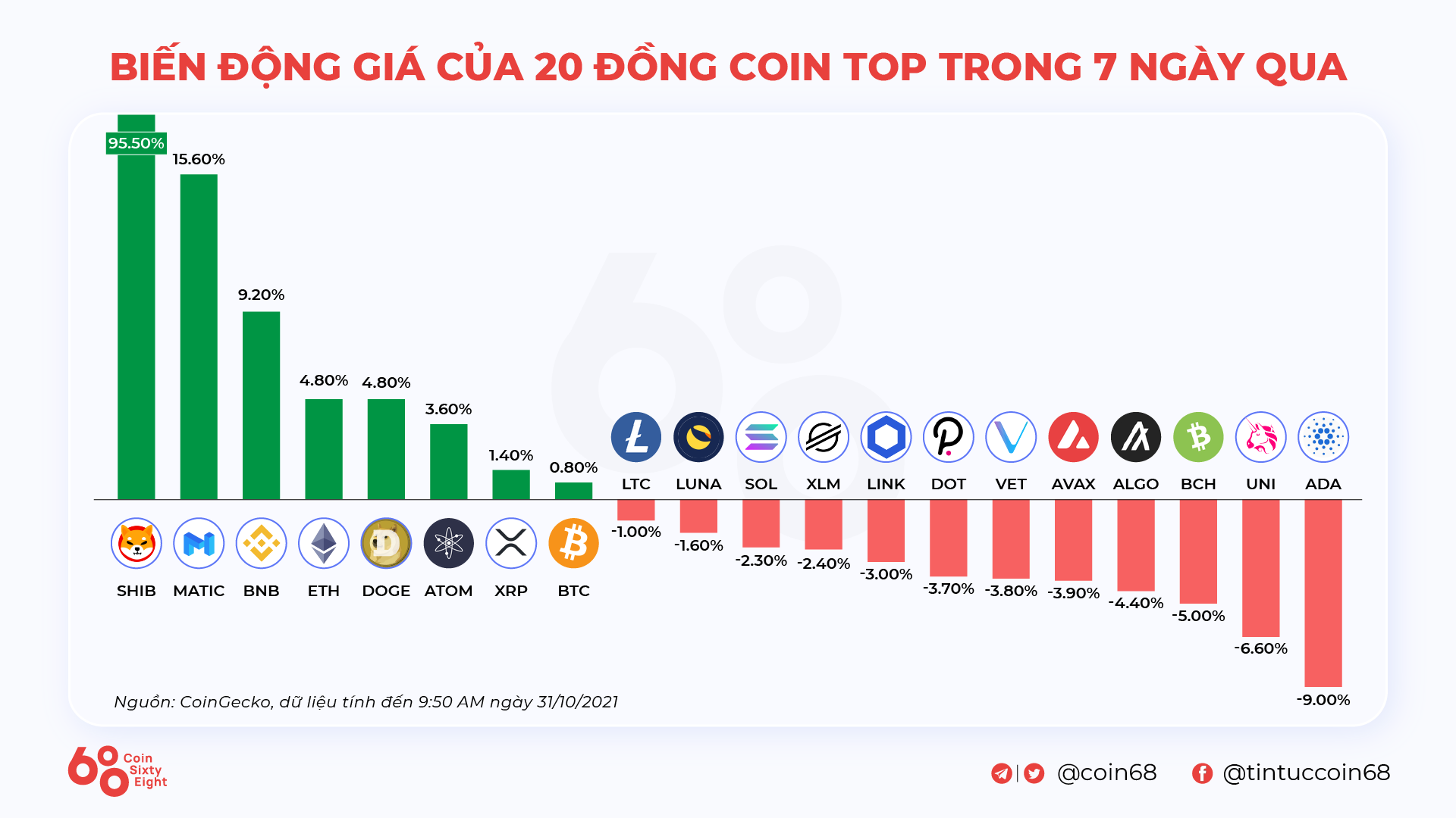 Biến động giá của 20 đồng coin top trong 7 ngày qua
