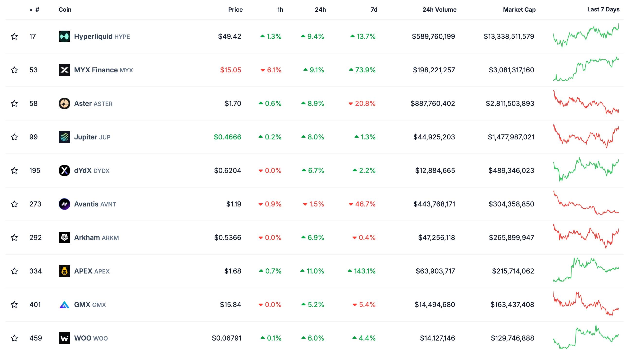 Thống kê hiệu suất của các token phái sinh hàng đầu. Nguồn: CoinGecko (Ngày 02/10/2025)