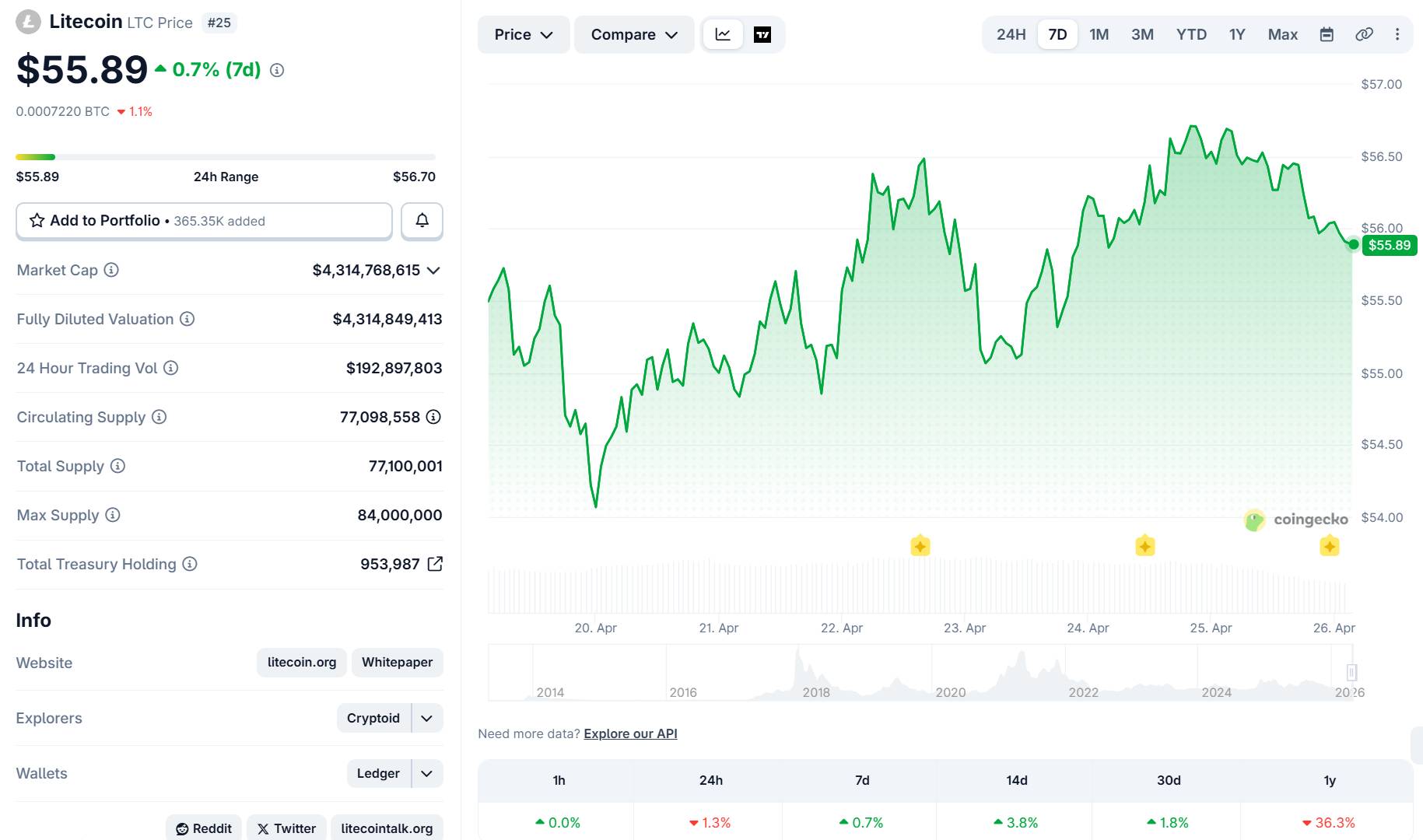 Biến động giá LTC trong 7 ngày gần nhất, ảnh chụp màn hình CoinGecko vào 10:35 AM ngày 26/04/2026