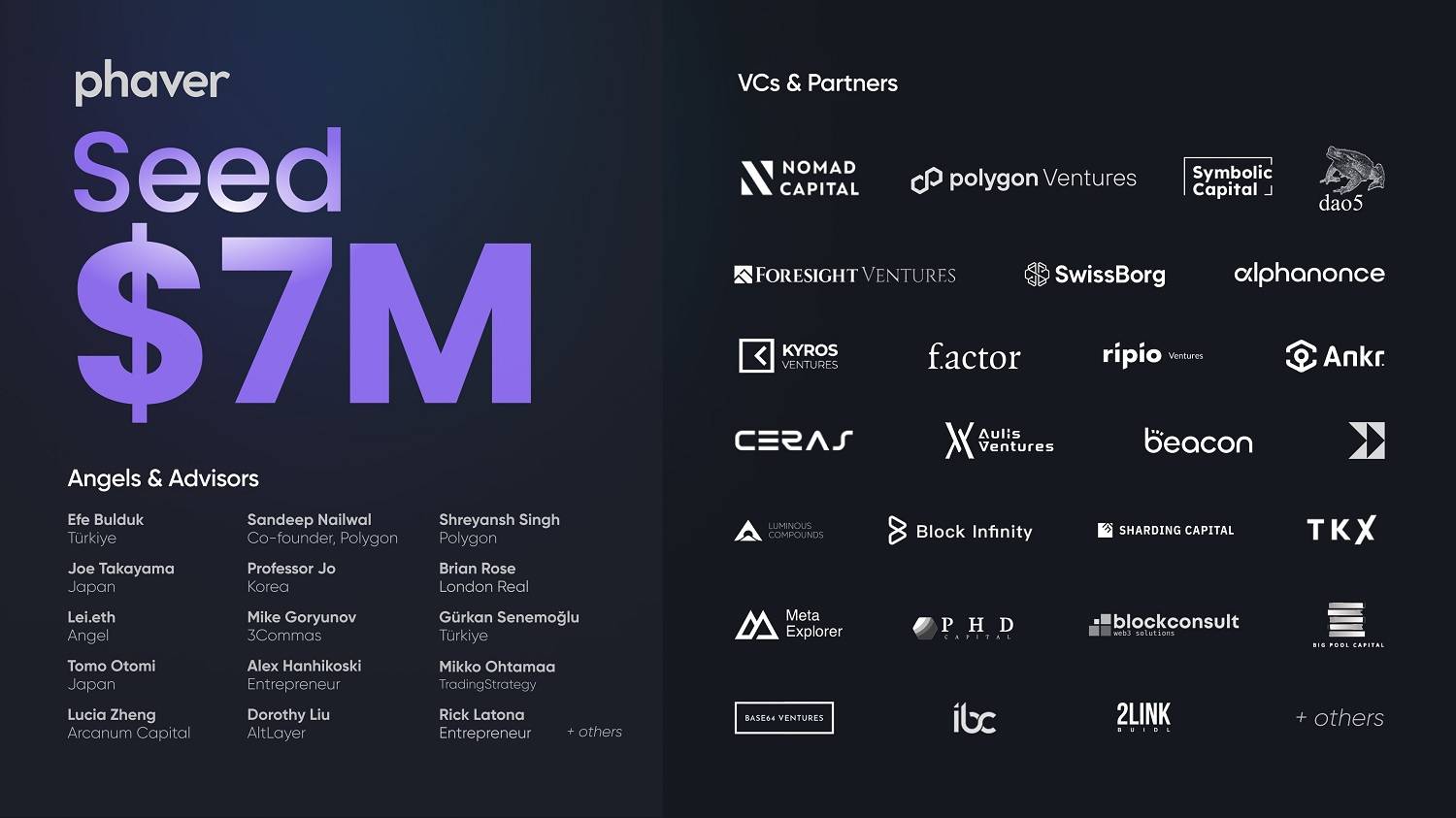 Các nhà đầu tư chính vào dự án này gồm Polygon Ventures, Nomad Capital, Symbolic Capital, dao5, Foresight Ventures, Alphanonce, f.actor, Superhero Capital và nhiều cái tên khác.