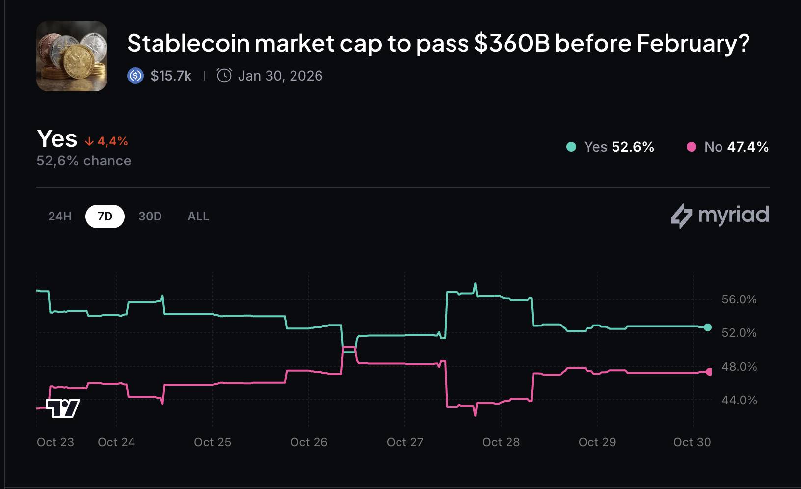 Thị trường dự đoán vốn hóa stablecoin trên Myriad. Nguồn: Myriad (Ngày 30/10/2025)
