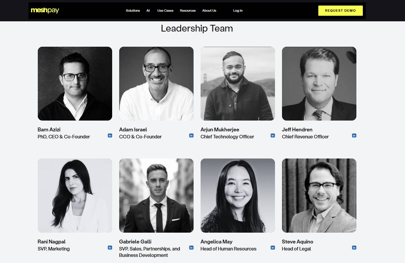 - Bam Azizi - Co-founder & CEO: Tốt nghiệp The Johns Hopkins University. Ông đã từng xây dựng và bán một startup trước khi thành lập Mesh cách đây 6 năm.