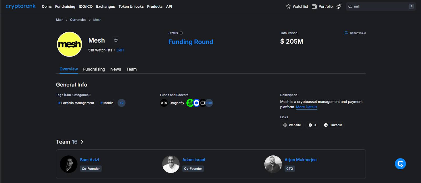 Tính đến đầu năm 2026, Mesh đã huy động tổng cộng hơn 205 triệu USD qua nhiều vòng gọi vốn với định giá 1 tỷ USD từ nhiều quỹ đầu tư như Dragonfly, Coinbase, Paradigm,...
