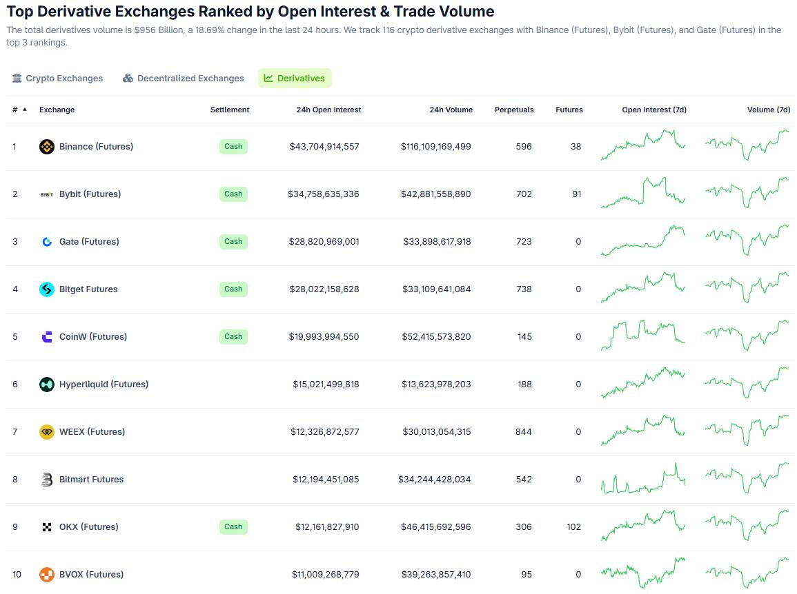 Danh sách 10 sàn CEX có khối lượng giao dịch phải sinh lớn nhất, chụp vào ngày 08/10/2025 trên CoinGecko.