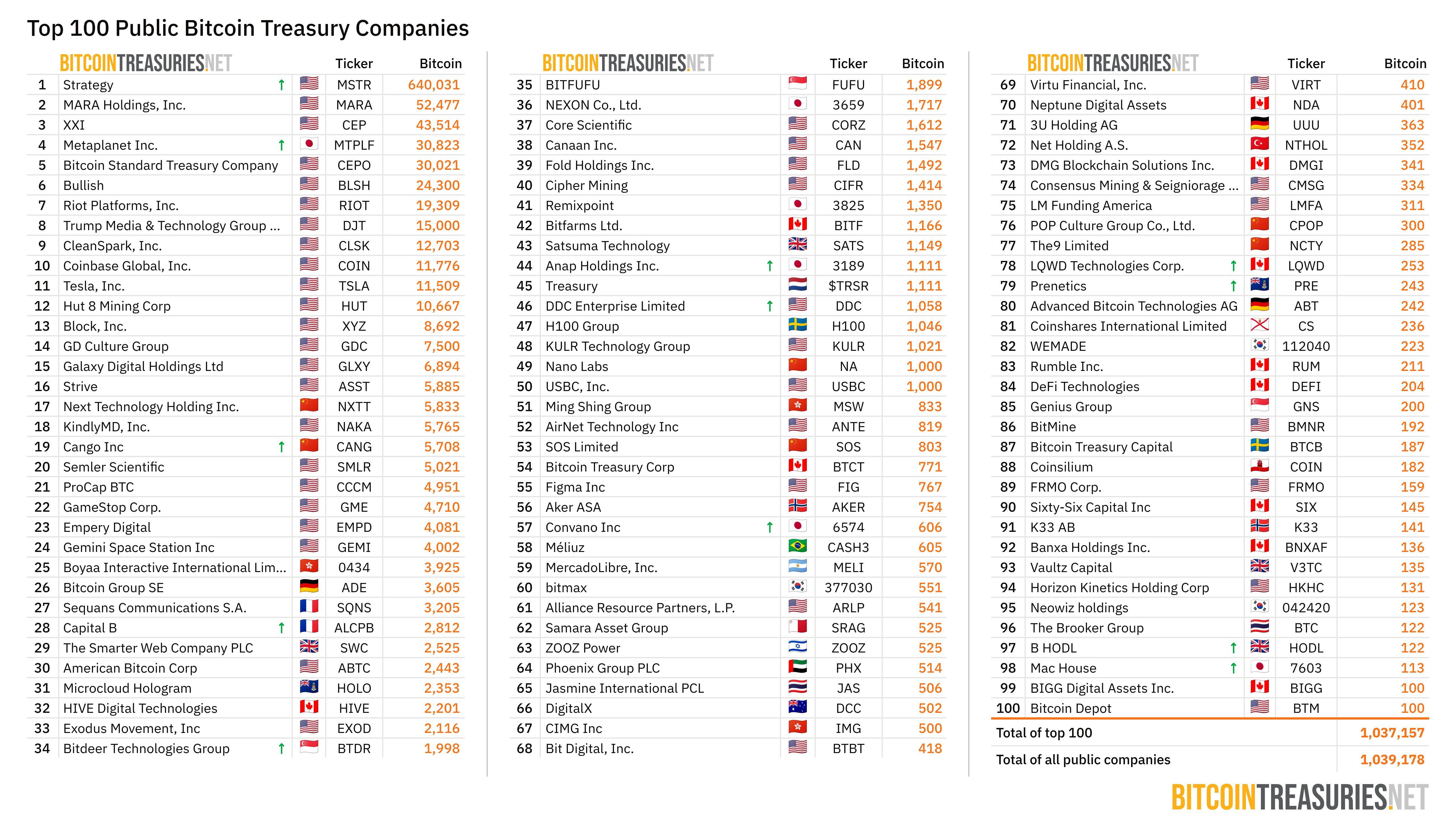 Danh sách 100 công ty niêm yết sở hữu nhiều Bitcoin toàn cầu. Nguồn: Bitcoin Treasuries (01/10/2025)