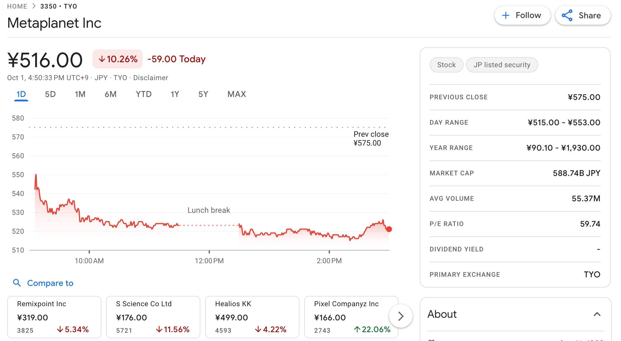 Giá cổ phiếu Metaplanet trong phiên giao dịch gần nhất, ảnh chụp màn hình Google Finance lúc 03:15 PM ngày 01/10/2025