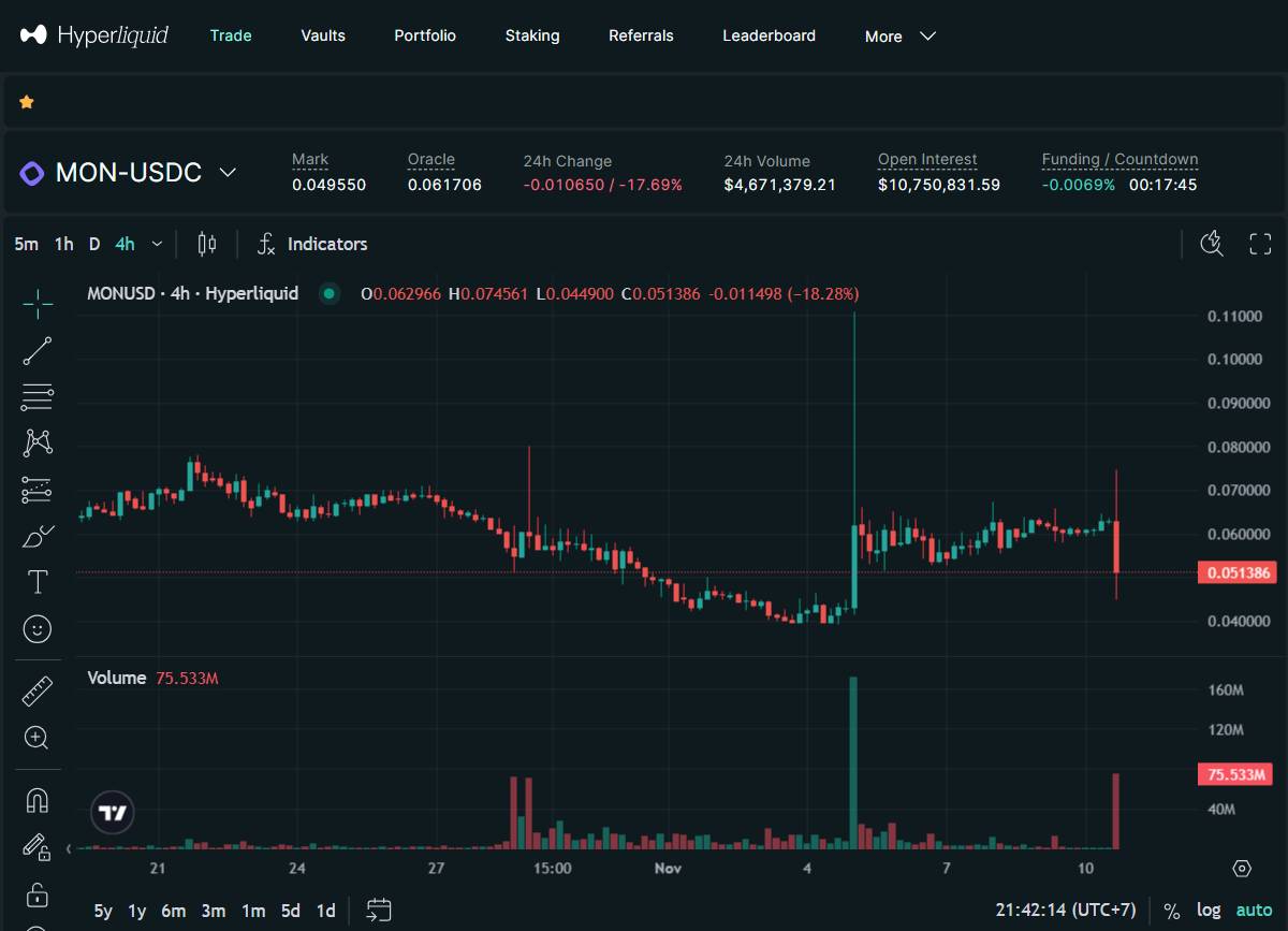 MON hiện đang được giao dịch trước trên Hyperliquid với giá gần 0.05 USD, tương đương FDV 5 tỷ USD, dù đã có lúc vọt lên 0.075 USD vào thời điểm xuất hiện tin tức dự án ICO trên Coinbase.