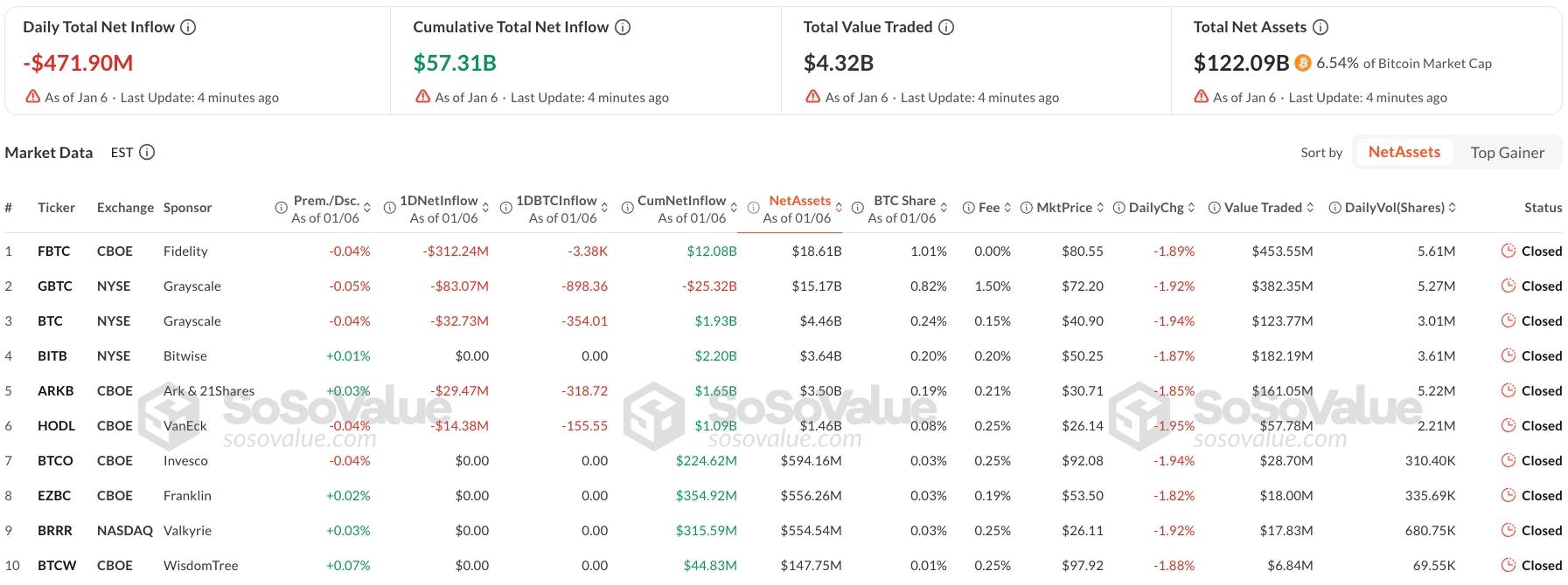 Thống kê tình hình hoạt động của các quỹ ETF Bitcoin. Nguồn: Sosovalue (ngày 07/01/2026)