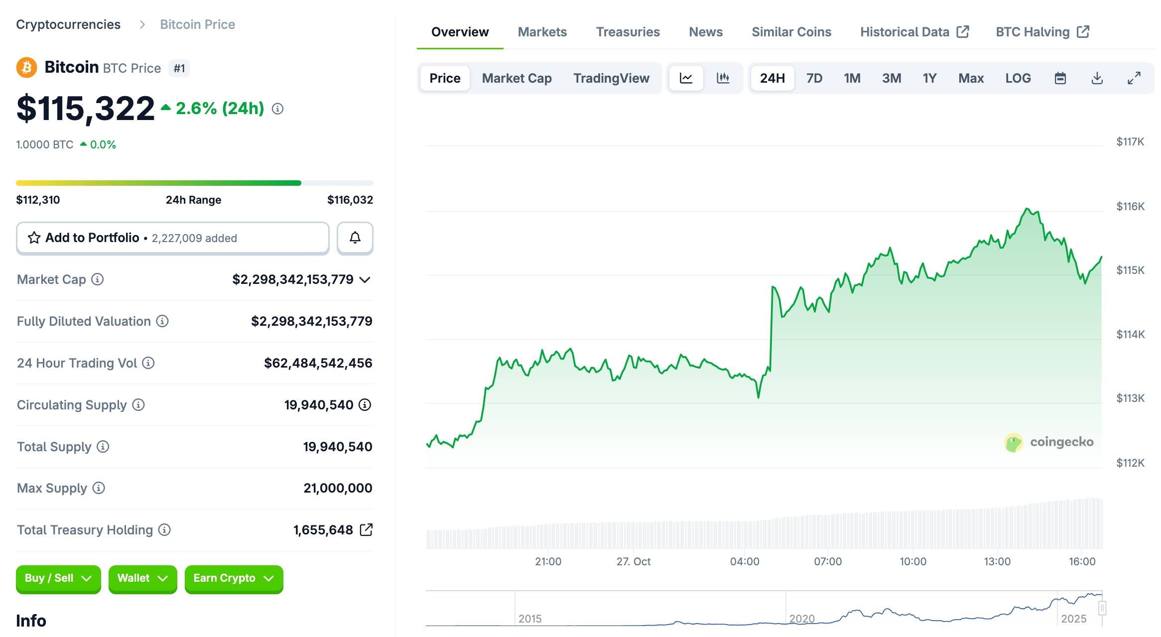 - Bitcoin đang giao dịch quanh mốc 115.322 USD tại thời điểm viết bài, tăng 2,6% so với 24h gần nhất, vẫn duy trì phong độ trong hôm nay, và chưa ghi nhận biến động mạnh thêm từ tin tức trên.