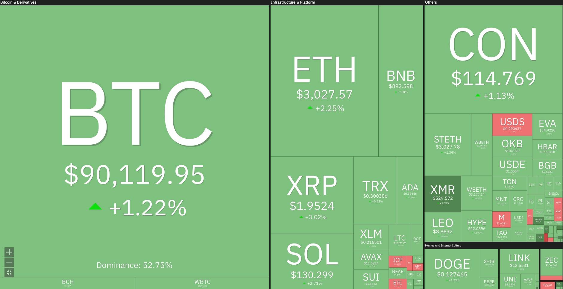 Đà hồi phục nhanh chóng lan sang nhóm altcoin. Ethereum tái chiếm ngưỡng tâm lý quan trọng 3.000 USD, tăng 2,2% trong ngày. Các token mang tính đầu cơ cao và được nhà đầu tư cá nhân ưa chuộng như XRP, BNB, Solana (SOL) hay Cardano (ADA) cũng vực dậy 2-5%.