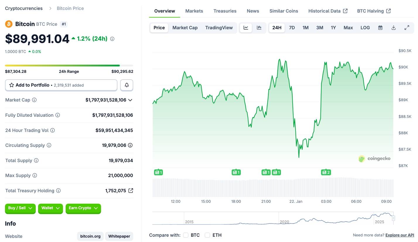 Biến động giá Bitcoin trong 24 giờ qua, ảnh chụp màn hình trên CoinGecko lúc 10:00 AM ngày 22/01/2026