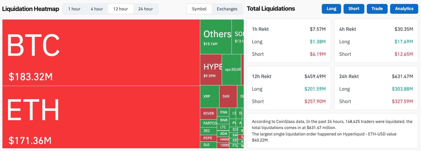 Sự đảo chiều nhanh của giá đã kích hoạt một làn sóng thanh lý trên thị trường phái sinh. Trong vòng 24 giờ gần nhất, đã có 631 triệu USD vị thế đòn bẩy bị xóa sổ, với tỷ lệ gần như cân bằng. Trong những giờ cuối của nhịp tăng, các vị thế short bị thanh lý dồn dập, phản ánh nhiều nhà giao dịch đã đặt cược sai hướng khi tin rằng áp lực vĩ mô sẽ tiếp tục đè nặng lên giá.