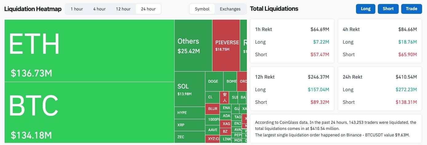 Trong vòng 1 ngày qua, có đến 414 triệu USD vị thế phái sinh crypto bị thanh lý, phần lớn đến từ phe mua khống (long).